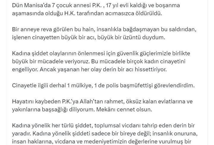 Bakan Yerlikaya: Manisa'daki cinayetle ilgili mülkiye ve polis başmüfettişi görevlendirdim