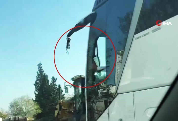 Kırılan aynayı elinde tutarak otobüsü böyle sürdü